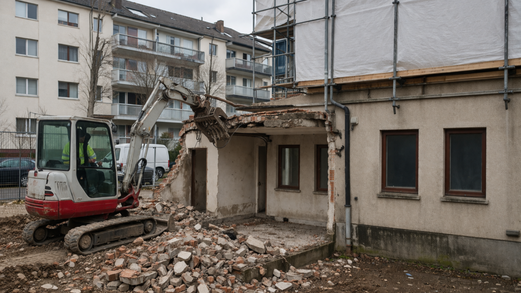 Ein Teilabbruch mit Bagger in Köln ist oft die wirtschaftliche Lösung, wenn ein Anbau, eine Garage, ein Nebengebäude oder ein Hallenteil gezielt zurückgebaut werden soll. Entscheidend sind dabei Zugang, Schutzmaßnahmen, Statik und die passende Rückbaumethode – besonders im Bestand.